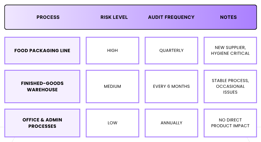 In food manufacturing in particular, where hygiene, traceability, spoilage, allergen control and regulatory oversight are high, audit frequency becomes a risk-mitigation lever.